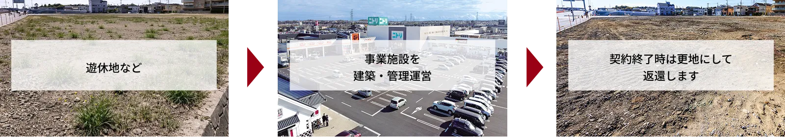 お借りした⼟地は、当社が事業施設を建築し、土地をお返しするまで責任をもって管理運営するため当社による建築・管理運営で、借地後も安心です。