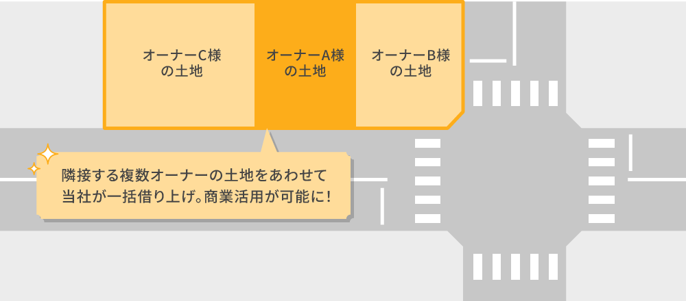 当社が周辺の土地状況を調査した所、周辺の土地のオーナー様も有効活用を考えていることが判明したため、当社が交渉し、土地の一括借上げを行い、ドラッグストアの建設をご提案しました。