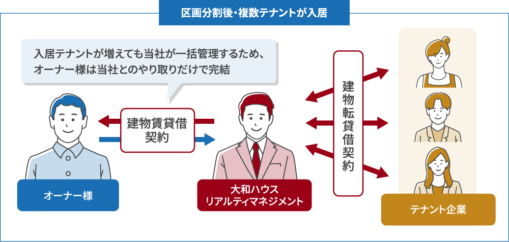 当社が周辺のマーケットを分析した結果、やはり一棟貸しのテナント誘致は難しいと判断し、オーナー様で追加投資が必要ではあるものの、建物を複数の区画に分けて複合施設としてリノベーションを行うプランを計画。一方で区画をわけるとテナントとの交渉ごとが増えるため、当社が借り上げてテナントに転貸する「サブリーススキーム」をあわせて提案しました。